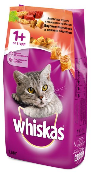 Вес упаковки: 800 Бренд: Whiskas Страна производитель: Россия Возраст: Старше 12 месяцев Назначение: Повседневный Особенность: Для взрослых кошек Ингридиенты: Говядина, Кролик - Отзывы