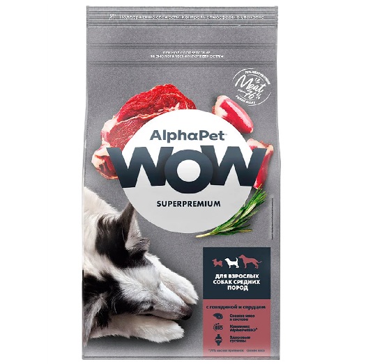 AlphaPet WOW Сухой корм для взрослых собак средних пород, Говядина и сердце